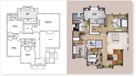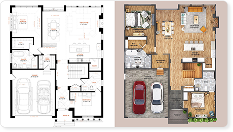 Le planimetrie 2D sono ormai caratteristiche essenziali nel mercato immobiliare. Presentate ai clienti una planimetria professionale, che illustri la disposizione della casa con pavimenti e arredi strutturati.
